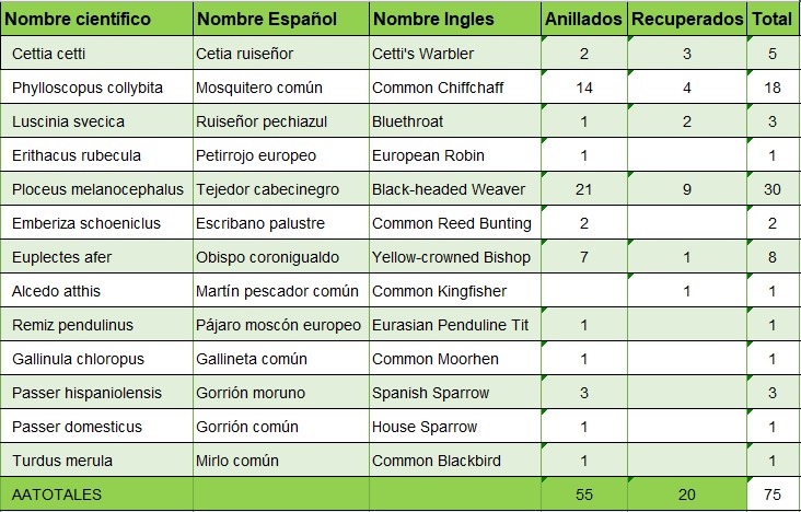 Capturé un total de 144 individuos, de los cuales 17 fueron recapturas de 12 especies diferentes. Dos de ellas fueron las más interesante para mí: dos escribanos palustres y una recuperación extranjera de ruiseñor pechiazul, que, además de llevar la anilla de metal, portaba otra de pvc alfanumérica en su pata derecha. Las especies capturadas más abundantes fueron los tejedores cabecinegros y los mosquiteros comunes.