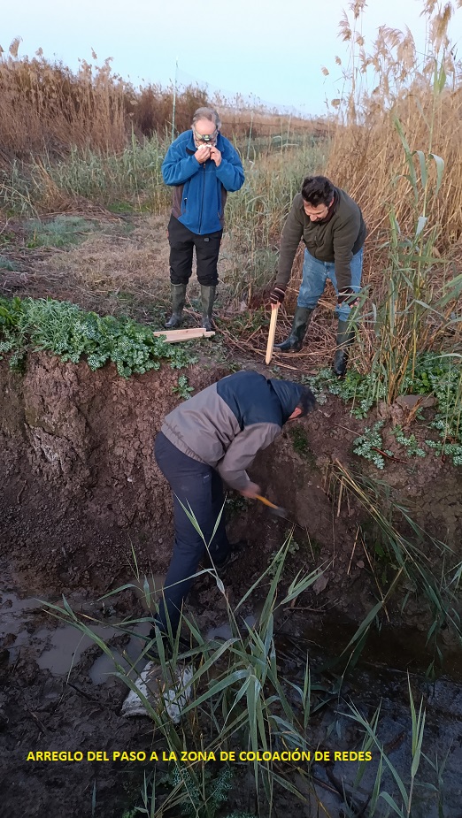 Comenzamos a montar las redes sobre las 7:00 a.m. en la zona denominada “curva del convento” en el Paraje Natural del Brazo del Este. Colocamos seis redes, pero antes tuvimos que arreglar el paso que nos obstaculizaba la entrada a la zona donde las solemos colocar ya que han construido una especie de canal para el vaciado de los arrozales. El día fue típicamente otoñal, con una temperatura propia de esta época del año, llegando al final de la jornada empezó a estropearse, levantándose viento, lo que produjo una baja en capturas.