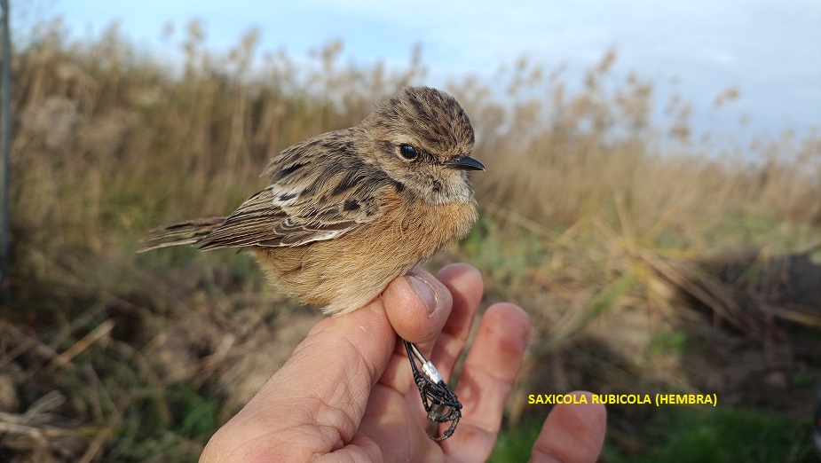 Capturé un total de 144 individuos, de los cuales 17 fueron recapturas de 12 especies diferentes. Dos de ellas fueron las más interesante para mí: dos escribanos palustres y una recuperación extranjera de ruiseñor pechiazul, que, además de llevar la anilla de metal, portaba otra de pvc alfanumérica en su pata derecha. Las especies capturadas más abundantes fueron los tejedores cabecinegros y los mosquiteros comunes.