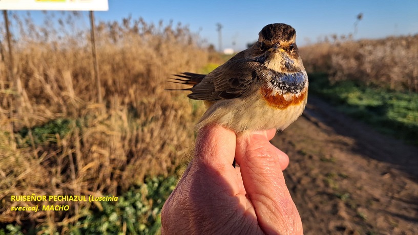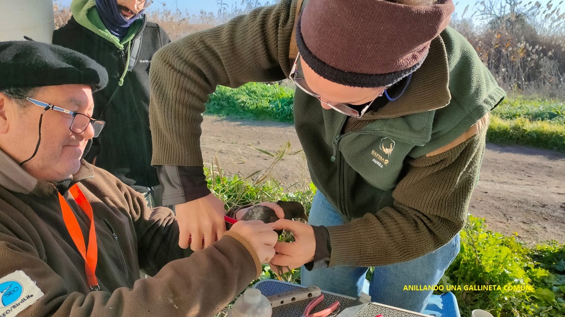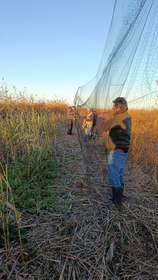 Comenzamos a montar las redes sobre las 7:00 a.m. en la zona denominada “curva del convento” en el Paraje Natural del Brazo del Este. Colocamos seis redes, pero antes tuvimos que arreglar el paso que nos obstaculizaba la entrada a la zona donde las solemos colocar ya que han construido una especie de canal para el vaciado de los arrozales. El día fue típicamente otoñal, con una temperatura propia de esta época del año, llegando al final de la jornada empezó a estropearse, levantándose viento, lo que produjo una baja en capturas.