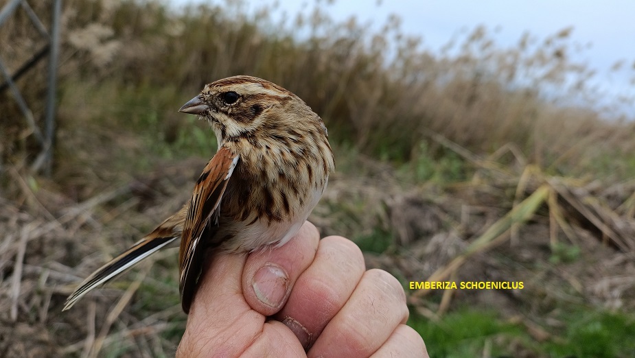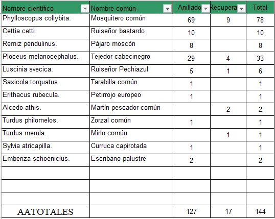 Capturé un total de 144 individuos, de los cuales 17 fueron recapturas de 12 especies diferentes. Dos de ellas fueron las más interesante para mí: dos escribanos palustres y una recuperación extranjera de ruiseñor pechiazul, que, además de llevar la anilla de metal, portaba otra de pvc alfanumérica en su pata derecha. Las especies capturadas más abundantes fueron los tejedores cabecinegros y los mosquiteros comunes.