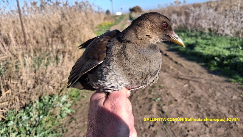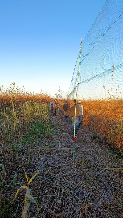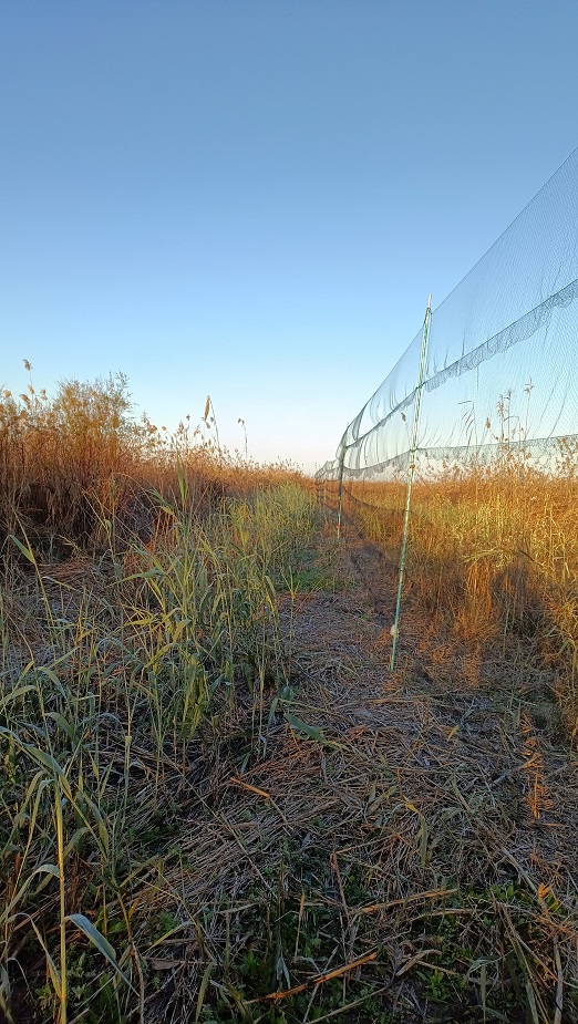 Comenzamos a montar las redes sobre las 7:00 a.m. en la zona denominada “curva del convento” en el Paraje Natural del Brazo del Este. Colocamos seis redes, pero antes tuvimos que arreglar el paso que nos obstaculizaba la entrada a la zona donde las solemos colocar ya que han construido una especie de canal para el vaciado de los arrozales. El día fue típicamente otoñal, con una temperatura propia de esta época del año, llegando al final de la jornada empezó a estropearse, levantándose viento, lo que produjo una baja en capturas.